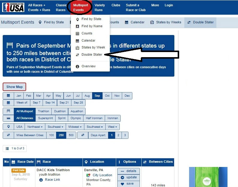 The “Double Stater” menu is used to search for triathlons held on consecutive days in adjacent states.